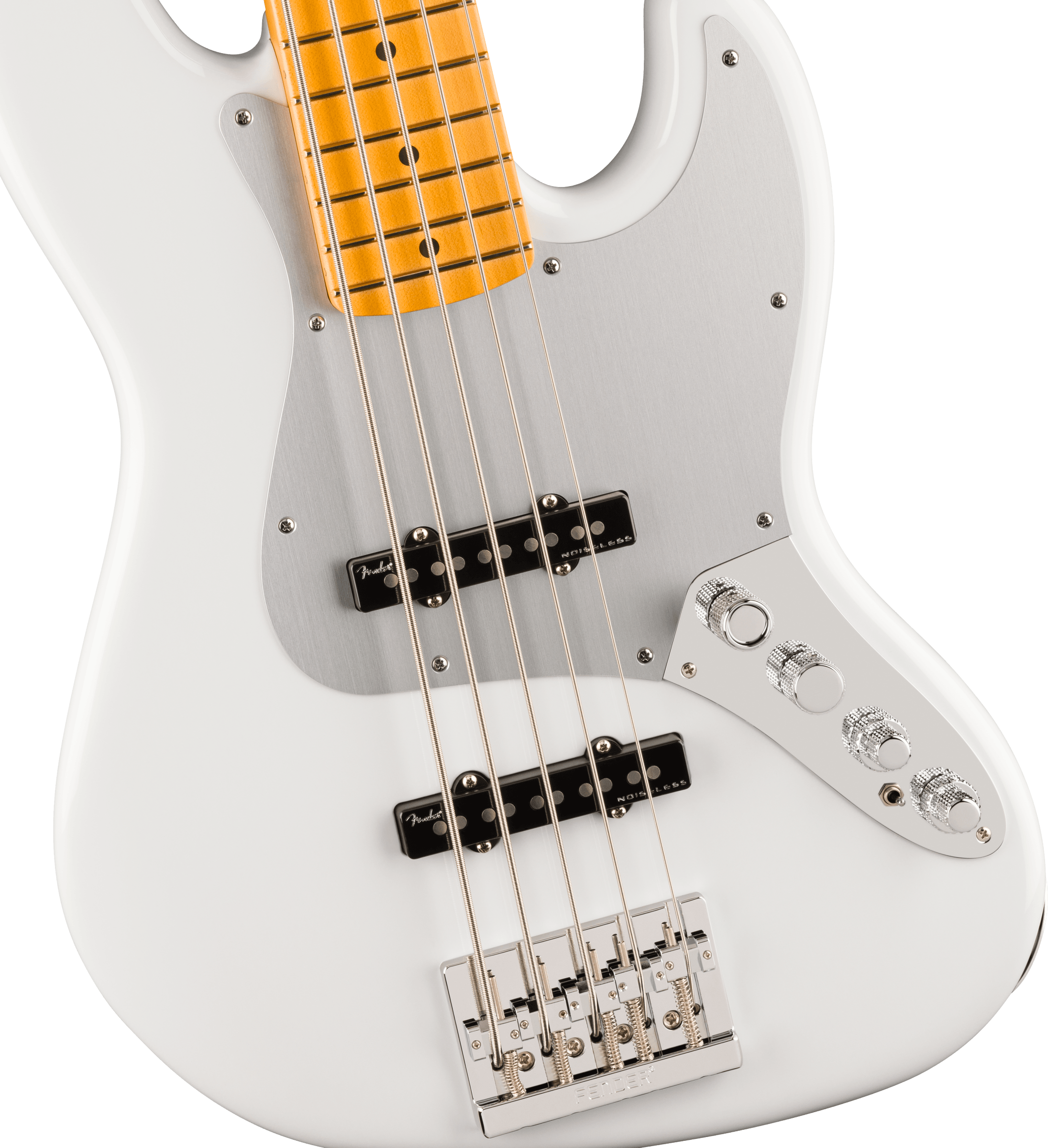 outfitted with a set of specially designed ultra ii noiseless vintage jazz bass pickups, this bass delivers a massive tonal range, from vintage warmth to modern snap, all without a hint of hum. the redesigned preamp features unprecedented control to unlock endless tonal possibilities. key features include s-1 switching for active/passive operation, passive tone control and 3-band active eq with switchable midrange frequency. additional road-ready features including an adjustable himass top-load or string-through-body bridge, fender light-weight tuners with tapered shafts, knurled aluminum knobs and 1-ply anodized aluminum pickguard.
